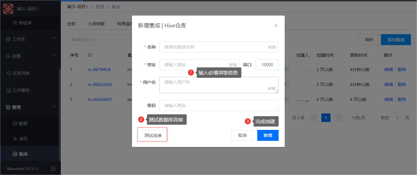 在项目中的管理-集成模块中,选择hive仓库并点击添加集成,输入集成名称并配置hive数据库地址、端口、用户名(密码可不填)等信息后,点击测试连接,系统会自动检查对接数据库状态,连接成功后点击新增即可完成创建。
