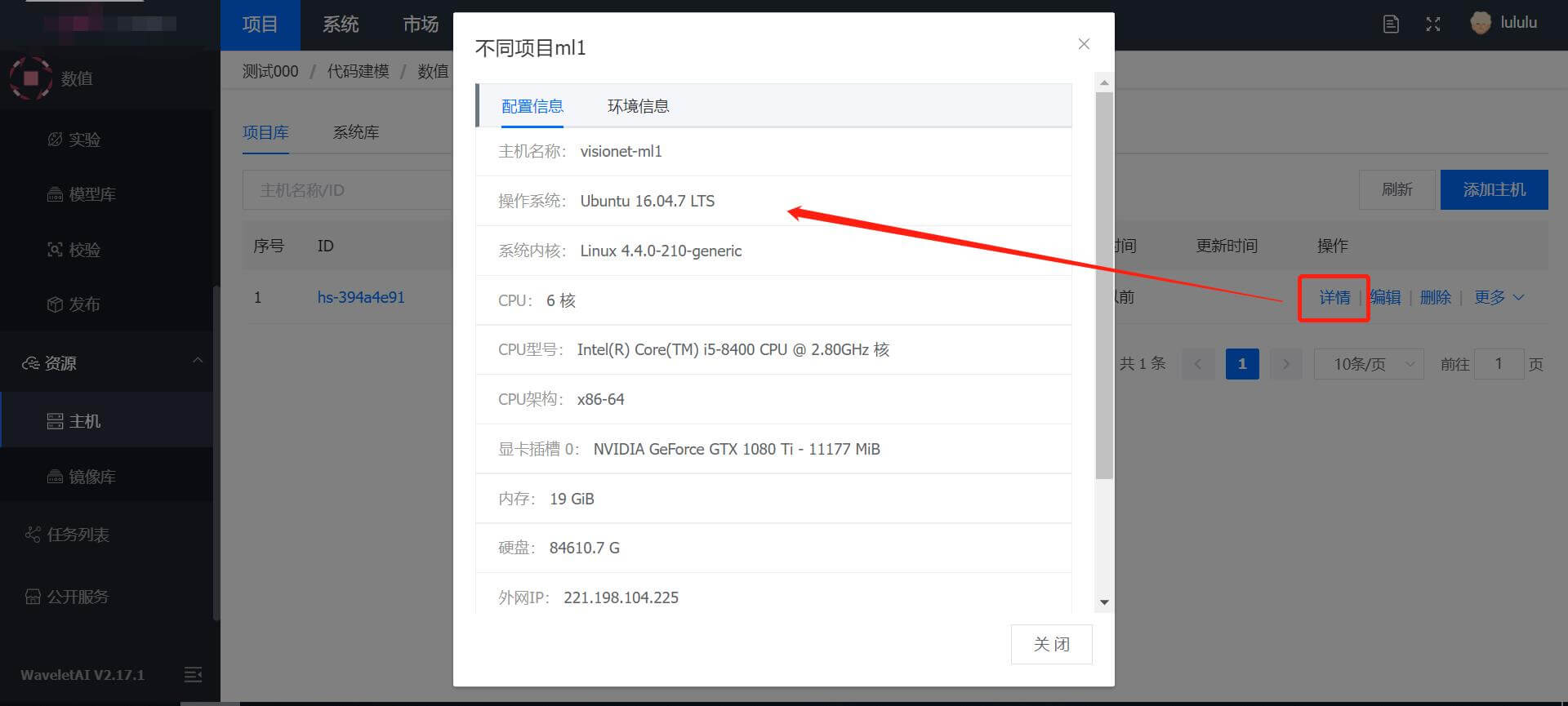 点击左侧【资源】,查看该模型的可调用的主机配置以及镜像库信息。