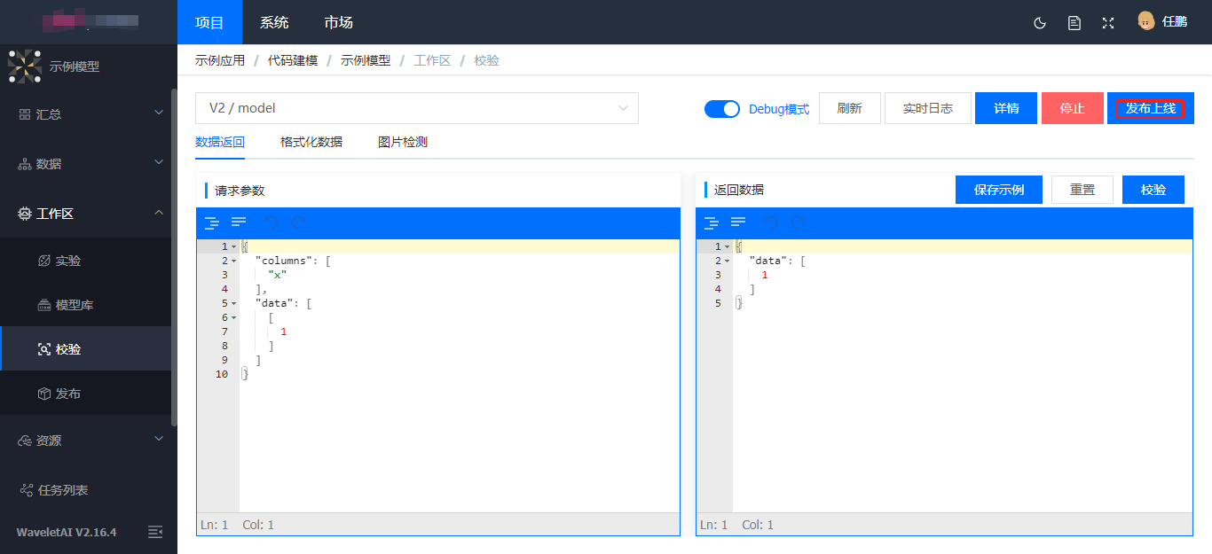 完成模型校验成功后,点击右上方操作栏【发布上线】,进行模型在线部署。