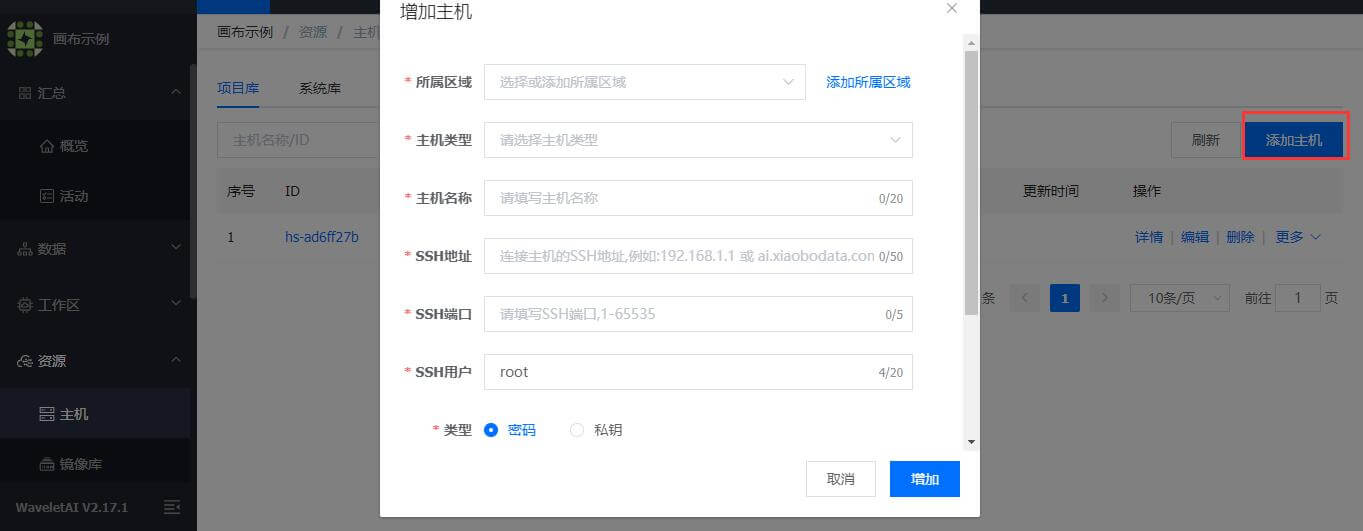 在列表页面,单击添加主机按钮,实现新主机的添加功能。添加主机资源后,可在用户模型训练时自动ssh连接。